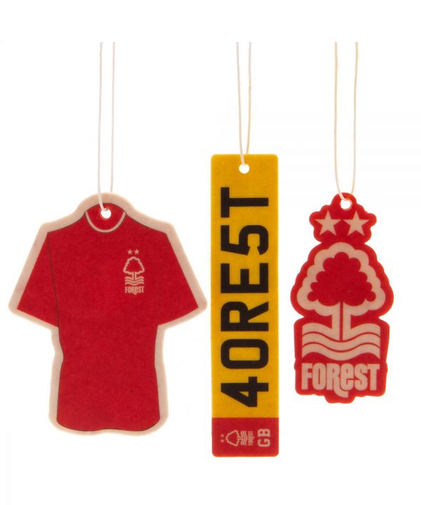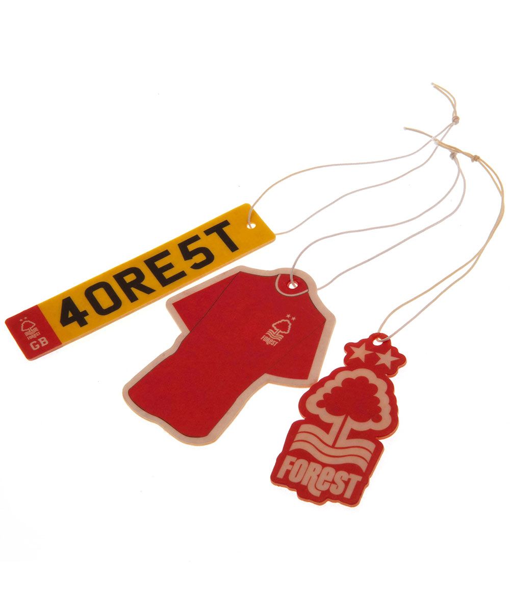 Official Nottingham Forest FC 3 Pack Air Fresheners with crest, kit, and number plate designs.